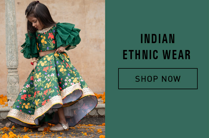 You can now shop for girls' Indian ethnic wear online featuring anarkalis, lehengas, and shararas for babies to teens. Our ethnic wear collection celebrates the spirit of Indian prints and silhouettes crafted from high-quality materials and handcrafted details. Shop Ethnic Wear