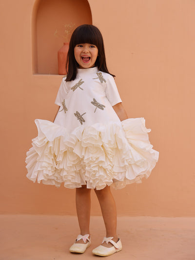 - This enchanting white dress features gold dragonfly embellishments and a voluminous ruffled hem.